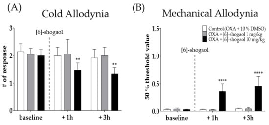 The analgesic effect of intraperitoneal injection of [6]-shogaol in oxaliplatin-induced allodynia in mice (A,B). Behavioral tests were conducted four days after 6 mg/kg of oxaliplatin (i.p.) injection. Cold allodynia (A) was assessed by using acetone drop test and mechanical allodynia (B) was measured by using von Frey filament test. Control group mice were treated with 10% of DMSO. Two different doses of [6]-shogaol was used (1 and 10 mg/kg). Baseline: before the injection of 10% DMSO or [6]-shogaol. +1 h: 1 h after 10% DMSO or [6]-shogaol treatment. +3h: 3 h after injection of 10% DMSO or [6]-shogaol administration. Data are presented by mean ± SEM. Control (OXA + 10% DMSO): n = 6, OXA + [6]-shogaol 1 mg/kg: n = 6, OXA + [6]-shogaol 10 mg/kg: n = 6. ** p < 0.01, **** p < 0.0001 vs. Control with two-way ANOVA followed by Tukey’s multiple comparisons test.