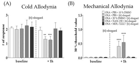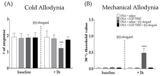 2.2. Intraperitoneal Injection of [6]-Shogaol Decreased Cold and Mechanical Alloydnia in Mice