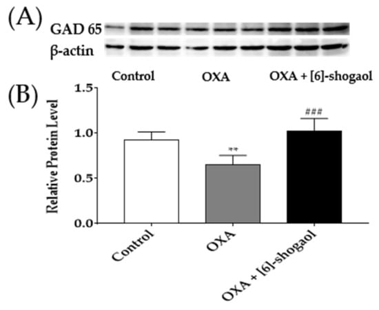 GAD65 protein concentration in the lumbar 4–5 spinal cord segments following intraperitoneal injection of [6]-shogaol. GAD65 protein binding band density image (A). The density of GAD65 protein concentration was quantified compared to β-actin (B). Control group received 5% glucose. OXA and OXA + [6]-shogaol groups received oxaliplatin injection four days prior to experiments. Data are presented by mean ± SEM. Control: n = 6, OXA: n = 6, OXA + [6]-shogaol: n = 6. ** p < 0.01 vs. Control and ### p < 0.0001 vs. OXA with one-way ANOVA followed by Tukey’s multiple comparisons test.