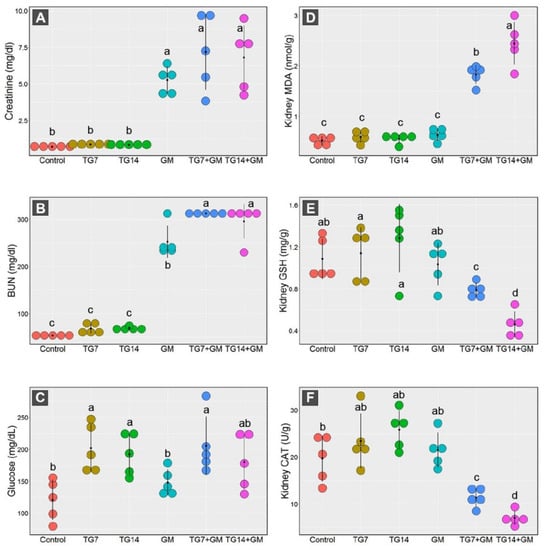Dot plot panel with the means (black dot) and 95% confidence interval (the stretching out black lines from the means) of the creatinine (A), BUN (blood urea nitrogen) (B), glucose (C), MDA (malondialdehyde) (D), GSH (reduced-glutathione) (E), CAT (catalase enzyme) (F) in the control, TG7 (tigecycline, 7 mg/kg), TG14 (tigecycline, 14 mg/kg), GM (gentamicin), TG7+GM, and TG14+GM groups. The different lower case letters are considered statistically significant at p ≤ 0.05.
