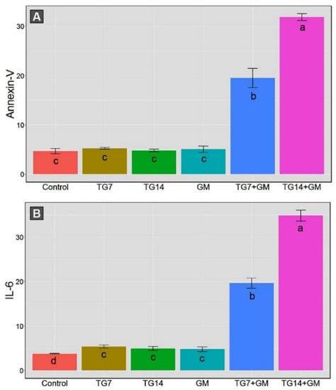 The bar plot panel with the means and 95% confidence interval of the kidney apoptotic cell obtained from annexin-V (A) and the tissue levels of the inflammatory cytokine (IL-6) (B) in the control, TG7 (tigecycline, 7 mg/kg), TG14 (tigecycline, 14 mg/kg), GM (gentamicin), TG7+GM, and TG14+GM groups. The different lower case letters are considered statistically significant at p ≤ 0.05.