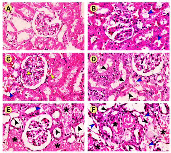 After fixation of the renal tissue in 10% neutral-buffered formalin for 72 h, the tissue was progressively dehydrated in ascending grades of ethyl alcohol and cleared in xylene. Next, all specimens were embedded in Paraplast, cut into 5 μm sections, and then stained with hematoxylin and eosin (H&E) for histological inspection. Furthermore, according to Aydın et al. [51], the alterations of the histopathological parameters of the kidney were graded as follows: no, (−); mild, (+); moderate, (++), and severe (+++) histological changes, respectively. Five random fields at 400× were checked blindly using a light microscope (DM3000, Leica, Germany).