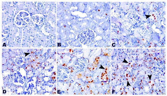 The kidney tissue sections were deparaffinized in xylene and rehydrated using descending grades of alcohol. The antigen retrieval process was performed in 10 mM sodium citrate buffer boiled in a microwave. Then, endogenous peroxidases were blocked using 0.03% hydrogen peroxide for 5 min. Tissue sections were washed gently with PBS and the nonspecific sites were blocked by 5% BSA. Next, the sections were incubated in a humidity chamber with the primary antibody (proliferating cell nuclear antigen; PCNA, Thermo Fisher Scientific, Manor Park, United Kingdom) at a dilution rate of 1:200 for 60 min at 37 °C, followed by washing for 3-times in PBS. After, all slides were incubated for 45 min at 37 °C with the secondary antibody (Envision system labeled polymer reagent; Dako, Kyoto, Japan). The positive brown stained nuclei were visualized by 3,3-diaminobenzidine-substrate chromagen, DAB (Dako, Kyoto, Japan), and counterstained with Mayer’s hematoxylin for 5 s.