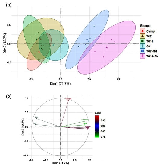 All of the investigated parameters (creatinine, BUN, glucose, MDA, GSH, CAT, annexin-V, IL-6) were loaded into two major dimensional components (Dim1 and Dim2), explaining 84.4% of the total variance. Most of the examined parameters were discriminated by Dim1, and thus described by the larger proportion of variance (71.7%), while the lower proportion of variance (12.7%) was captured by Dim2 (Figure 6). The PCA score plot revealed two distinct groups, where the groups receiving combined therapy (TG7+GM and TG14+GM) were clustered together and separated from those receiving individual treatments (control, TG7, TG14, and GM) (Figure 6a). In the PCA loading plot, creatinine, BUN, MDA, annexin-V, and IL-6 were positively associated with the TG7+GM and TG14+GM groups. On the other hand, GSH and CAT were positively linked with the control, TG7, TG14, and GM groups (Figure 6b).