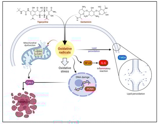 BUN: blood urea nitrogen; CAT, catalase; FDA, Food and Drug Administration; GM, gentamicin; GSH, reduced-glutathione; H2O2, hydrogen peroxide; IL-6, interleukin-6; MDA, malondialdehyde; NO, nitric oxide; O2•−, superoxide anion; OH•, hydroxyl radical; PCA, principal component analysis; PCNA, Proliferating cell nuclear antigen; TG, tigecycline; NF-κB, Nuclear factor-kappa B.