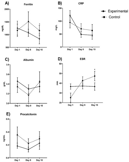 Inflammatory parameters between experimental and control groups evaluated in COVID-19 patients. Ferritin diminishes in the experimental group approximately by 50% (p = 0.001). In (A) we observe ferritin values; (B) CRP levels; in (C) albumin; (D) ESR and (E) procalcitonin during hospital stay days comparing both experimental vs control group. Auto-controlled analysis did not show significant changes in the experimental in ESR (p > 0.05), but in the control group, it significantly increased (p = 0.0001). Considering a covariate adjustment, experimental group ESR was significantly decreased in comparison with the control group (p = 0.01). CRP and procalcitonin did not significantly decrease in the experimental group (74% and 33%, respectively; p > 0.05 in both). * p < 0.05.