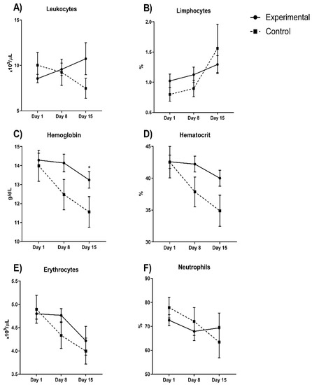 Blood count parameters between experimental and control group evaluated in COVID-19 patients (A) leukocytes; (B) lymphocytes; (C) hemoglobin; (D) hematocrit; (E) erythrocytes and (F) neutrophils during hospital stay days comparing both experimental vs control group. Hemoglobin and hematocrit decreased in the experimental group by 5.6 and 9.7%, respectively (p > 0.05). Cellular counting shows that erythrocyte and neutrophils decreased (44% and 10%, respectively), but not significantly, in the experimental group while leukocytes and lymphocytes increased, but not significantly (10.2% and 34.3%, respectively). * p < 0.05.