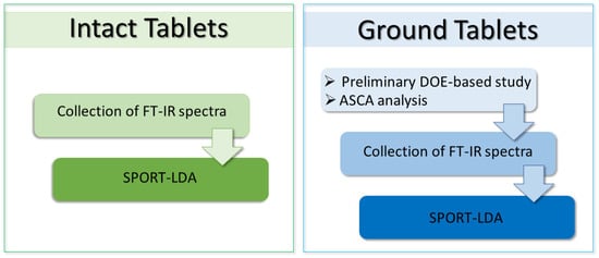 Due to the different physical nature of the analyzed samples (i.e., intact or ground tablets), two slightly diverse analytical workflows were applied (schematized in Figure 1). At first, spectra were collected on tablets as they were, and then they were preprocessed and classified by SPORT-LDA. On the other hand, since the spectra collected on ground tablets were noisier than those on the entire specimens, the procedure applied to these samples had an additional preliminary DOE-based study for the optimization of the instrumental parameters. In particular, a full-factorial design was used for investigating the effect given by the instrumental variation in the ATR module pressure, the spectral resolution, and the number of scans (more details on the DOE are given in Section 2.1) on the signals. After the collection of spectra, finalized for the preliminary investigation, ASCA was used to determine what spectroscopic conditions would improve the overall intensity.