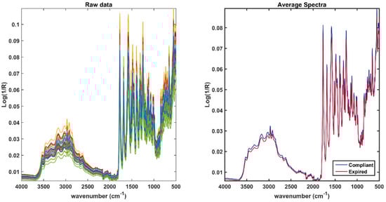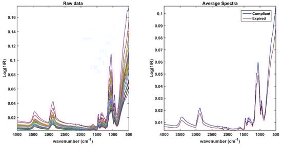 Raw spectra collected on the entire tablet (left plot); average spectra of expired (red) and compliant tablets (right plot).