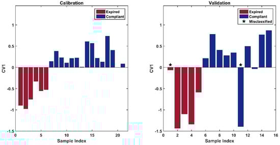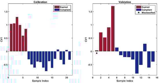 This calibration model led to a cross-validated accuracy of 100.0% (on training samples) and highlighted an opposite trend with respect to the previous analysis. In fact, as it can be seen in Figure 7, in this case, expired samples present negative values of CV1, whereas the compliant individuals have positive ones. The application of the classification model to the test set led to the misclassification of only one sample per class, leading to a total correct classification rate of 86.7% in the validation set. This corresponds to a correct classification rate of 80.0% and 90.0% on expired and compliant samples, respectively.