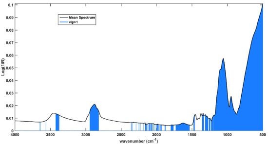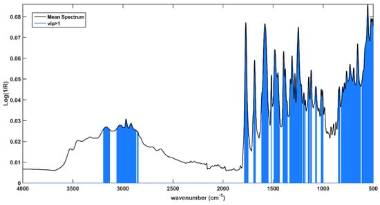 Variable importance in projection (VIP) analysis was used to individuate which spectral variables are the most relevant for the solution of the classification problem. This approach allows the calculation of VIP indices, which provide an indication of the contribution of every single variable to the model. Customarily, variables presenting a VIP index higher than 1 are considered relevant. In Figure 4, the solid black line represents the mean spectrum and variables associated to VIP indices >1 are highlighted in sapphire blue.