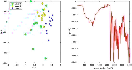 In particular, by looking at the loadings along SC1 (Figure 6), it is clear that the variation in the factor results in an overall change in intensity in the spectral profile. Observation of the score plot reveals that the maximum intensity corresponds to a negative score on SC1. The trials marketed as level 0, which correspond to a middle pressure of 50, generate a zero-centered cluster. The highest level (80) of the factor produced a distribution mainly localized at negative scores of SC1. Consequently, the spectral dataset collected with the aim of discerning compliant and expired samples was acquired, taking care of using a pressure of 80. As the other two factors (resolution and scans) were not significant, it was decided to reduce the spectrum noise by choosing a resolution of 8 cm−1 and the highest level of scans (24).