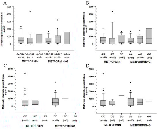 Metformin plasmatic concentration boxplots (ng/mL), including medians, interquartile ranges, and outliers (filled circles). (A) rs72552763 (OCT1). (B) rs622342 (OCT1). (C) rs316019 (OCT2). (D) rs2076828 (OCT3). Data are sorted according to genotype and treatment type (metformin to the left, metformin + glibenclamide to the right). No statistical difference was found.