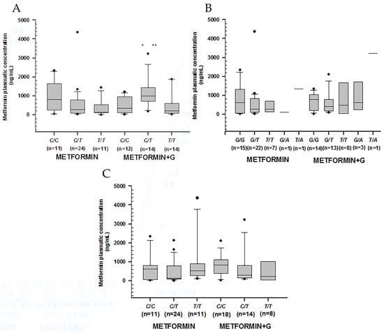Metformin plasmatic concentration boxplots (ng/mL), including medians, interquartile ranges, and outliers (filled circles). (A) rs1128503 (ABCB1). (B) rs2032582 (ABCB1). (C) rs1045642 (ABCB1). Metformin to the left, metformin + glibenclamide to the right according to genotype. Only C/T of rs1128503 reported both extra-group (metformin + glibenclamide) (** p = 0.002) and intra-group (metformin) statistical difference (* p = 0.007).
