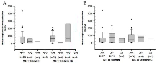 Metformin plasmatic concentration boxplots (ng/mL), including medians, interquartile ranges, and outliers (filled circles). (A) rs1799853 (*1/*2) and rs1057910 (*1/*3) in CYP2C9. (B) rs1934969 (IVS8 109 A/T) in CYP2C9. Metformin to the left, metformin + glibenclamide to the right according to genotype. No statistical difference was found either intra-group or extra-group.