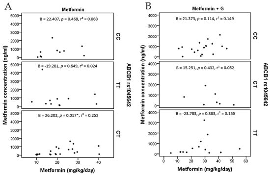 On the other hand, logistic regressions accounting for adjusted dose in terms of kg/weight/day and metformin plasmatic concentration across the three polymorphisms in ABCB1 found a correlation only with C/T of rs1045642 (p = 0.017) (Figure 4).
