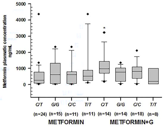 Metformin plasmatic concentration boxplots (ng/mL), including medians, interquartile ranges, and outliers (filled circles). From left to right: C/T of rs1128503; G/G of rs2032582; C/C of rs1045642; T/T of rs1045642, treated with metformin. The following boxplots correspond to the same genotypes under combined therapy. Only C/T of rs1128503 reported significant differences in both groups (* p = 0.002).
