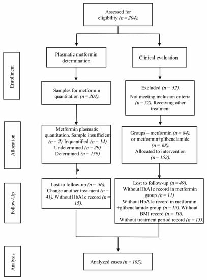 Out of the 204 initially evaluated profiles, 52 were eliminated due to not meeting inclusion criteria. Of these remaining 152 allocated for observation, 26 had no HbA1c record and 23 had no plasmatic metformin record; thus, only 103 were fit for biomarker analysis (Scheme 1).