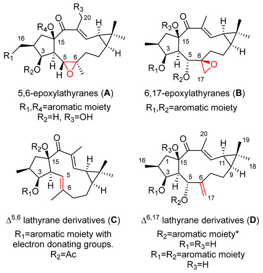 Four main sets of compounds have been used to perform SAR studies: the molecules are characterized by the existence of a 5,6 or a 6,17-epoxy ring (latilagascenes A–F and jolkinol B derivatives and epoxyboetiranes, respectively; 5,6-epoxylathyranes) and 6,17-epoxylathyranes, Figure 2A,B), and those possessing an endocyclic Δ5,6 (jolkinol D derivatives; Δ5,6 lathyrane derivatives Figure 2C) or exocyclic Δ6,17 double bond (lathyrol derivarives; Δ6,17 lathyrane derivatives Figure 2D).