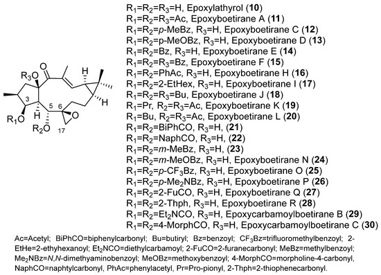 Trying to optimize epoxylathyranes as active MDR reversal agents, several compounds were isolated from the aerial parts of E. boetica [23]. The one obtained in greater quantity was subjected to various chemical transformations, generating a library of 16 compounds, epoxylathyrol (10), epoxyboetiranes (14, 21–28) and epoxycarbamoylboetiranes B and C (29–30) (Figure 4), which were evaluated as P-gp-mediated MDR reversers at non-cytotoxic doses in L5178Y ABCB1 transfected mouse T-lymphoma cells, by the accumulation of rhodamine-123 assay [24]. Most of the tested compounds showed a strong P-gp-modulating activity and were also able to synergistically increase the cytotoxicity of doxorubicin, restoring its sensitivity by reversion of the ABCB1-MDR phenotype. Structure–activity relationship studies indicated that the presence of an aromatic ring on these structures significantly enhances the inhibition of rhodamine-123 efflux (see Figure 2B) [24].