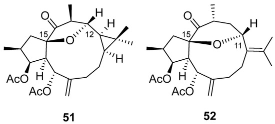 Therapeutic applications of herbal remedies containing lathyranes trace back over thousands of years, especially in traditional Chinese medicine. They find use for the treatment of different medical disorders, such as skin diseases, migraine, edema, intestinal parasites and gonorrhea [1,3]. These natural products and some synthetic derivatives have shown numerous interesting biological activities with clinical potential such as cytotoxicity, multidrug resistance reversal (MDR) ability, antiviral properties, anti-inflammatory activity and capability to induce neural progenitor cell (NPC) proliferation or differentiation into neurons [3,4,5].
