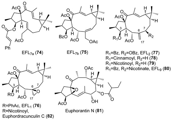 Chemical Structures of lathyranes from E. lathyris L. with MDR-modulating activity (compounds 74–82).