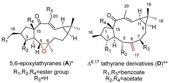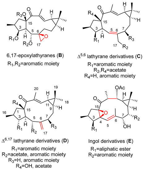 Selected functionalization patterns in biologically active compounds evaluated for their anti-inflammatory effects. (B) Functionalization pattern in 6,17-epoxylathyranes; (C) Functionalization pattern in Δ5,6 lathyranes; (D) Functionalization pattern in Δ6,17 lathyranes; (E) Functionalization pattern in ingol derivatives.
