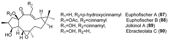In a previous study with diterpenes from E. fischeriana, jolkinol A (89) (Figure 12), the inhibitory activity on the formation of mammospheres in human breast cancer MCF-7 cells was observed [42]. Furthermore, jolkinol B (83) (Figure 9) was isolated from the roots of E. ebracteolata Hayata, and its cytotoxic activity tested against five cancer cell lines: HL-60 (human promyelocytic leukemia cell line), SMMC-7721 (human hepatocellular carcinoma cell line), A-549 (human lung cancer cell line), MCF-7 (human breast cancer cell line) and SW480 (colorectal cancer cell line), where it exhibited moderate cytotoxic effects [43].