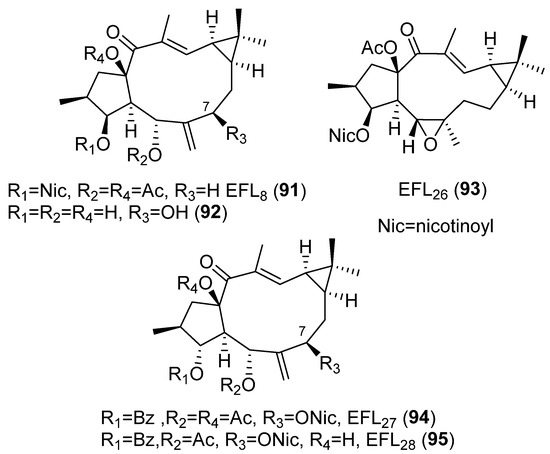 In comparison, the cytotoxic activity of EFL1–3 (76, 77 and 43) (Figure 6 and Figure 8), EFL7a (74) (Figure 8), EFL8 (91) and 7-hydroxylathyrol (92) (Figure 13), EFL9 (80) (Figure 8) and EFL26 (93) (Figure 13), together with other lathyrane-type diterpenes isolated from E. lathyris, EFL27 (94) and EF28 (95) (Figure 13), which are characterized for an α-orientation of their substituent at C-3, was also evaluated against several breast cancer cell lines. Results showed a strong cytotoxicity associated with 95 against the 786-0 and HepG2 cell lines. This indicated that not only the variety but also the configuration of substituent groups in this kind of compounds are of great importance for their bioactivity [45].