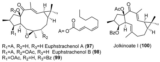 A study into the composition of the perennial herb Euphorbia stracheyi, two new lathyrane diterpenoids, euphstrachenols A and B (97–98) and nine analogues were isolated and identified from the methanol extract of its roots (Figure 15). The evaluation of their cytotoxicity against four human cancer cell lines, HGC-27 (stomach cancer), MV4-11 (leukemia), H460 (lung cancer), Skvo3 (ovarian cancer) and a murine cell line BaF3 (lymphocyte), indicated that all of them showed cytotoxicity against H460 and Skvo3 cell lines, but only six of them, euphstracehnols A (97) and B (98), 99 (Figure 15), EFL15 (euphoboetirane A, 54) (Figure 6), jolkinoate I (100) (Figure 15) and jolkinol B (83) (Figure 9) indicated moderate cytotoxicity against MV4-11 cell lines [47].