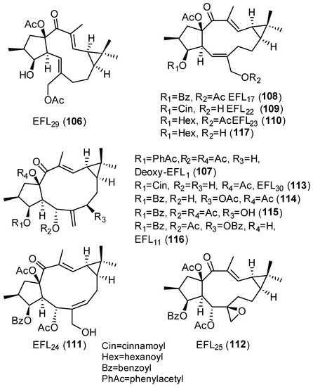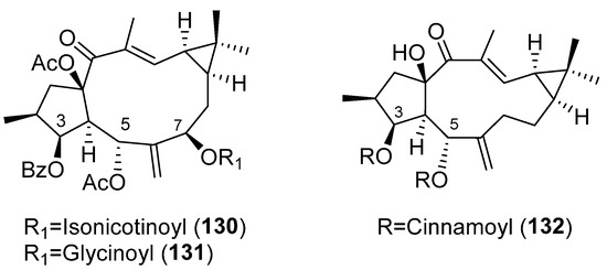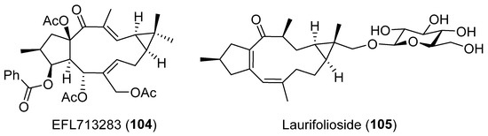 The cytotoxic activity of ingol-type diterpenes has also been evaluated. 3,12-diacetyl-7-angeloyl-8-methoxyingol (101), 7-angeloyl-12-acetyl-8-methoxyingol (102) and 3,12-diacetyl-7-hydroxy-8-methoxyingol (103) (Figure 16), isolated from E. nivulia, showed significant cytotoxic activity against Colo 205, MT2 and CEM cell lines, although some ingol derivatives had little or no activity [48].