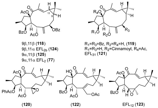 In a recent study, Zuo et al. evaluated the inhibitory activity against NO production induced by LPS in BV-2 microgial cell of twenty-one lathyrane diterpenoids [17]. Seventeen compounds, 43 (Figure 6), 74, 75 and 77 (Figure 8), 91 (Figure 13), 107–110 and 113 (Figure 18) and 118–125 (Figure 20), that demonstrated low cytotoxicity were found to be significantly active against LPS-induced NO overproduction in BV-2 microglial cells at 10 µM. Compounds 120 and 43 were the most potent (respectively, 6,17-epoxylathyrane (B) and Δ6,17 lathyrane (D) derivatives, Figure 19), showing an inhibitory effect approximately twice as active as the positive control resveratrol (20 µM) and reducing markedly the mRNA levels of pro-inflammatory cytokines IL6 and IL1β in LPS-stimulated BV2-cells. Structures 93 (Figure 13), 118 and 124 (Figure 20) were effective at the non-toxic concentration 1 µM, indicating that their effective concentration was lower than other tested compounds. Following the comparison of the activity shown by compounds 118, 124, 125 and EFL2 (77) (Figure 20), which are isomeric compounds in C-9 or/and C-11, it can be deduced that the anti-inflammatory activity depends on the configurations at C-9 and C-11 [17].
