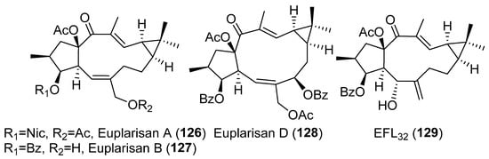 A systematic study of the anti-inflammatory activity of different types of lathyrane has been carried out by Wang et. al. [19]. Eleven new lathyranes along with ten known analogues, isolated from E. lathyris, were evaluated for their inhibitory activities against NO production induced by LPS in RAW264.7 macrophage cells. The tested compounds possess different patterns of substitution on the macrocyclic diterpene skeletons, including 17-hydroxyjolkinols, 17-hydroxyisolathyrols (two of them with an unusual trans-gem-dimethylcyclopropane unit), lathyrols (Figure 19D) and epoxylathyrols (Figure 19B). The most active compounds were found to be four 17-hydroxyisolathyrol derivatives, euplarisan A, B and D (126–128) (Figure 21), EFL17 (108) (Figure 18) and two lathyrols, EFL28 (95) (Figure 13) and EFL32 (129) (Figure 21). Comparison of the activity showed for all the tested compounds that the diterpenoids with an endocyclic Δ5,6 double bond (108 and 128) and a benzoate at C-3 have the highest inhibitory effect (Figure 19C) [19].