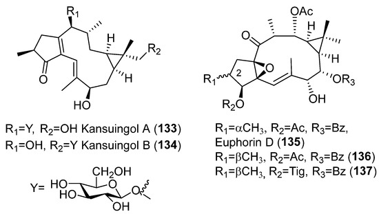 Lathyrane-type diterpene glycosides have demonstrated anti-inflammatory activity. Kansuingol A and B (133–134) (Figure 23), diterpenes isolated from the roots of Euphorbia kansui, were shown to be, at least in part, responsible for the anti-inflammatory effect shown by the butanol-soluble extract of the roots of this plant. This is because they potently inhibited the IL-6 production in HMC-1 cells stimulated by a combination of PMA and ionophore. Furthermore, 133 inhibited TNFα and IL6 mRNA expression level [67].
