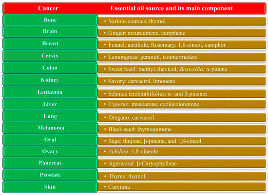 Examples of EOs with anticancer effects in cancers of the brain [74], colon [75,76], breast [77,78], skin (melanoma) [79,80], blood (leukemia) [81,82], oral tissues [83,84], bone [85], cervix [86], lung [87], prostate [88], kidney [89], liver [90], ovary [91], and pancreas [92].