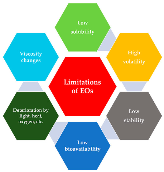 To date, the anticancer or antibacterial properties of hundreds of EOs remain only partially or not at all realized because of limitations preventing the exploitation of their possible applications and advantages. The limitations include low stability; high volatility; and a high risk of deterioration on exposure to direct heat, humidity, light, or oxygen [93]. Other properties that need mitigation for use in EOs include low water solubility (because of their hydrophobic nature) and low bioavailability (Figure 5).