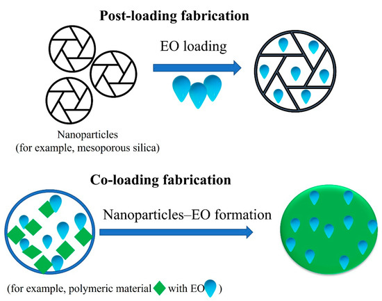 Schematic representation of two loading strategies that can be efficiently used for EO nanoformulations: post-loading fabrication and co-loading fabrication. The first approach is more likely for inorganic materials, and second approach is more likely for organic materials.