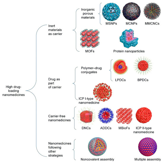 Schematic representation of the fabrication strategies of nanomedicines with a high drug-loading capacity. MSNs (mesoporous silica nanoparticles), MCNPs (mesoporous carbon nanoparticles), MMCNCs (mesoporous magnetic colloidal nanocrystal clusters), MOFs (metal organic frameworks), LPDCs (linear (polymer–drug conjugates)), BPDCs (branched PDCs), ICPs (infinite coordination polymers), DNCs (drug nanocrystals), ADDCs (amphiphilic drug–drug conjugates), and MBioFs (metal–biomolecule frameworks). Reprinted from Ref. [107]. Copyright 2017 Shen et al. by Dove Medical Press Limited (Creative Commons Attribution—Non-Commercial (unimported, v3.0), open-source publishing.