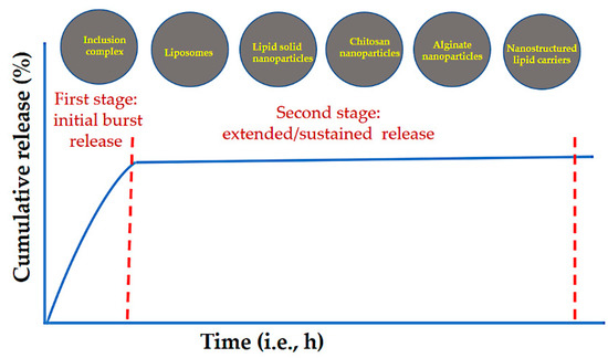 Schematic representation of the two-stage release pattern for EOs from various nanostructures, such as polymers, lipids, and inclusion complexes. As indicated in the literature, this release profile for EOs is the most common.