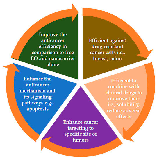 An interesting approach is to develop codelivery systems by combining EOs with clinical anticancer drugs to reduce the side effects and enhance the solubility of anticancer drugs [48], including unusual EO substances [49].