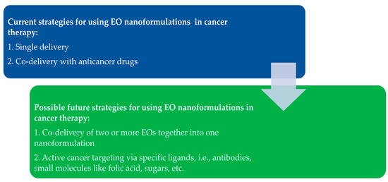 One of the strategic research directions of nanomedicine is to improve targeted and/or controlled drug delivery [49,56,94,95,96,97,98,99,100,101,102]. In addition, there is a need to improve EO stability and bioavailability along with cancer targeting through delivery system [103].