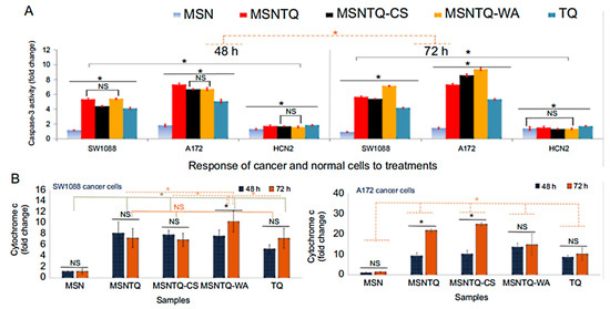 The molecular mechanisms of targets of core nanoformulation (MSNTQ), core–shell nanoformulations (MSNTQ-CS and MSNTQ-WA), and thymoquinone (TQ) in a free form on brain cancer cells (SW1088 and A172) and normal brain cells (HCN2) after 48 and 72 h of incubation. (A) Caspase-3 activation in the fold change measured by ELISA for all treatments, and (B) cytochrome c intracellular release in the fold change measured by RT-PCR for all treatments. All data are expressed as the mean ± standard deviation. The differences are expressed with * at p < 0.05 based on the least significant difference. Nonsignificant differences are marked as NS. In the case of caspase-3, the solid gray line indicates the significance between cell lines, and the dashed orange line indicates differences between incubation times. Reproduced from Ref. [99], Dove Medical Press Limited, an open-access source.
