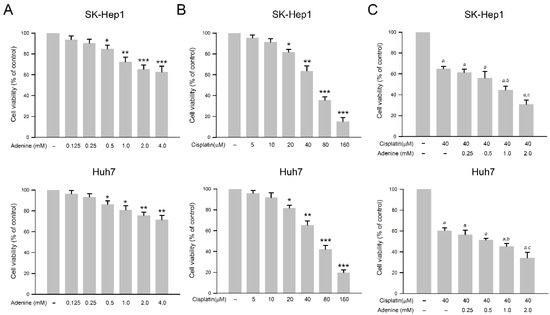 Inhibitory effects of adenine, cisplatin, and their combination on cell viability of HCC cells. (A,B) Cells were treated with adenine or cisplatin alone at the indicated concentrations for 24 h, or (C) treated with 40 µM cisplatin alone or 40 µM cisplatin combined with adenine at the indicated concentrations for 24 h, and then subjected to cell viability assessment using SRB assay. Cell viability is presented as mean ± SD. Statistics analysis was carried out by three independent experiments. *, **, and ***, p < 0.05, 0.01, and 0.001 as compared to control; a, p < 0.05 as compare to control; b and c, p < 0.05 and 0.01 as compared to cisplatin alone.