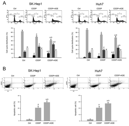 Cisplatin is known to induce DNA damage and subsequently result in cell cycle arrest and apoptosis [18]. Next, we explored the effects of adenine on cisplatin-induced cell cycle arrest and apoptosis of HCC cells. As shown in Figure 2A, the results of the cell cycle distribution analysis showed that cisplatin (40 µM) increased the sub−G1 and S phase ratios in SK−Hep1 and Huh7 cells compared to control (p < 0.05), and the combination of cisplatin (40 µM) and adenine (2 mM) further increased the subG1 and S phase ratios compared to cisplatin alone (p < 0.05). In addition, the apoptosis assay using Annexin V−PI staining and flow cytometric analysis showed that cisplatin alone led to 21.3 ± 4.6% and 20.7 ± 3.8% apoptotic cells in SK−Hep1 and Huh7 cells, respectively (p < 0.05 as compared to control). Furthermore, the combination of cisplatin and adenine resulted in 30.1 ± 3.5% and 28.9 ± 2.8% apoptotic cells in HCC cells, respectively (p < 0.05 as compared to cisplatin alone). Together, these observations reveal that adenine synergistically promotes the cisplatin−induced S phase arrest and apoptosis of HCC cells.