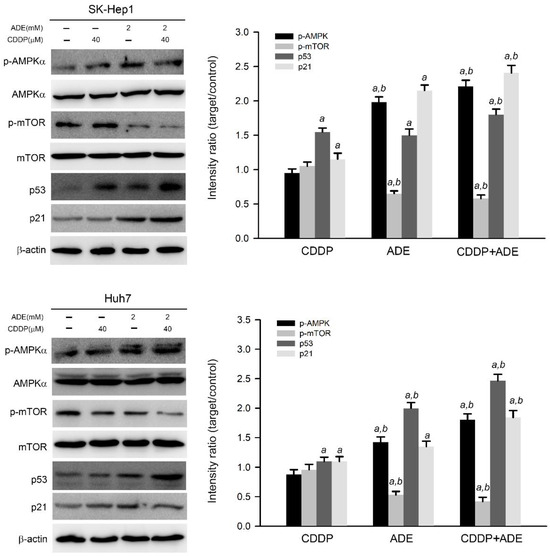 Adenine has been reported as an AMPK activator and has shown potential anticancer activity against a variety of cancer cells [11,19]. Therefore, the effects of adenine on AMPK signaling in HCC cells were then examined. As shown in Figure 3, adenine alone significantly induced threonine 172 in the alpha subunit of AMPK, which triggered AMPK activation and reduced mTOR phosphorylation, a downstream target of AMPK [20] in SK-Hep1 and Huh7 cells. Parallel to AMPK activation, adenine alone also increased the expression of p53 and p21 in HCC cells. Moreover, the combination of adenine and cisplatin treatment increased more AMPK phosphorylation and p53 and p21 expression in HCC cells compared to treatment with adenine or cisplatin alone (p < 0.05). Consistently, the combination of adenine and cisplatin treatment resulted in reduced mTOR phosphorylation in both HCC cells compared to treatment with adenine or cisplatin alone (p < 0.05). Taken together, these results show that the combination of adenine and cisplatin jointly promotes the activation of AMPK and the expression of p53 and p21 in HCC cells.