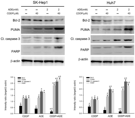 The effects of cisplatin, adenine, and the combination on the apoptotic cascade were investigated. As shown in Figure 4, cisplatin or adenine alone significantly reduced the expression level of Bcl-2 and increased the expression level of PUMA, cleaved caspase-3, and PARP in SK-Hep1 and Huh7 cells compared to the control (p < 0.05), respectively. Moreover, the combination of adenine and cisplatin treatment contributed to the lower expression level of Bcl-2 and higher levels of PUMA, cleaved caspase-3, and PARP in HCC cells compared to treatment with adenine or cisplatin alone (p < 0.05). Taken together, the results show that the combination of adenine and cisplatin jointly reduces the Bcl-2 level and promotes the apoptotic cascade in HCC cells.
