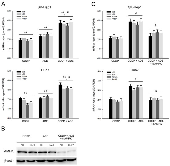 In parallel to the protein level, the mRNA expression of the cell cycle regulator and pro-apoptotic and anti-apoptotic genes was further validated after treatments with adenine, cisplatin, or their combination. As shown in Figure 5A, the qPCR analysis showed that adenine and cisplatin significantly upregulated the mRNA expression of p53, p21, PUMA, and PARP (p < 0.01), and the combination of cisplatin and adenine upregulated the mRNA expression of p53, p21, PUMA, and PARP more than cisplatin and adenine alone (p < 0.05) in both HCC cells. The role of AMPK in the combination of cisplatin and adenine was then explored. AMPK knockdown was carried out using specific siRNAs, and the results showed that AMPK protein levels clearly decreased in SK-Hep1 and Huh7 cells (Figure 5B). The effects of a combination of cisplatin and adenine on AMPK knockdown-HCC cells were then assessed. As shown in Figure 5C, AMPK knockdown significantly reduced the mRNA expression of p53, p21, PUMA, and PARP induced by the combined treatment with cisplatin and adenine (p < 0.05). Collectively, these observations show that the combination of cisplatin and adenine significantly induces p53-mediated pro-apoptotic gene expression, and AMPK is involved in the induction of this p53-mediated pro-apoptotic gene expression.