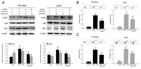Involvement of AMPK-mediated p38 MAPK activation in combination of adenine and cisplatin-induced apoptosis of HCC cells. (A) Cells were transfected with siControl or siAMPK for 72 h, treated with combination of adenine and cisplatin, then subjected to immunodetection of p38 MAPK and Bax. (B,C) Cells were transfected with siAMPK for 72 h or pretreated with BIRB-796 for 2 h, treated with combination of adenine and cisplatin, and then subjected to apoptosis assay using Annexin V-PI staining. * and **, p < 0.05 and 0.01 as compared to control; #, and ##, p < 0.05 and 0.01 as compared to CDDP alone; & and &&, p < 0.05 and 0.01 as compared to CDDP + ADE; a, p < 0.05 as compared to the control; b, p < 0.05 as compared to adenine combined with cisplatin.