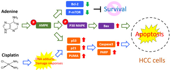 Proposed adjuvant activity of adenine on cisplatin-induced apoptosis of HCC cells. Our findings demonstrate that adenine induces activation of AMPK and p38 and increases pro-apoptotic Bax, while downregulating anti-apoptotic Bcl-2 and mTOR. Adenine also synergistically promotes p53/p21/PUMA axis-mediated apoptosis in response to cisplatin.