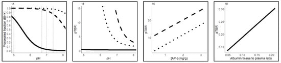 Base model 1, the model reflecting weak bases, predicts the pTBR by calculation of the pH-driven distribution to cellular components (Figure 3B). Tissue-specific fractional tissue volumes of cellular components, including intracellular water, extracellular water, neutral lipids and neutral phospholipids are reflected by, respectively, Fiw, Few, Fnl and Fnp. By use of the pH values of the cellular components intracellular water, neutral lipids and neutral phospholipids pHiw, pHnl, pHnp relative to the pH of plasma (pHp), the fraction of unprotonated drug available for diffusion to these cellular parts is predicted. The pH values of the cellular components are shown in Figure 3. The octanol/water partition coefficient (P) is included for binding affinity of the unprotonated drug to neutral lipids and phospholipids in the cell membrane. Since a weak base such as erlotinib is highly (99%) unprotonated in plasma, albumin binding in the extracellular water is a predominant process of tissue distribution. The albumin binding was predicted based on the multiplication of the association constant (Ka) for albumin (Figure 1D) with the tissue specific albumin tissue-to-blood ratio []. The formula for calculation of Ka and the base model equations can be found in Supplemental Materials S-II (base model 1, Equations (S1)–(S4)). A schematic overview of base model 1 is depicted in Figure 3A.